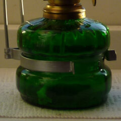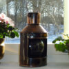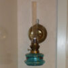 Oljehuset i grönt glas nästan lyser i solen och vill man – kan man ha den stående i fönstret eller på bordet med sin vackra reflektor – enkelt att ta bort från reflektorn om du hellre vill det