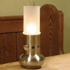 Fotogenlampa i rostfritt med dimmat glas designad av Jan Linqvist 1980. Oljelampan är 23 cm hög och är en dm bred. Brinntiden är ca 15 timmar vid bormalt användande.