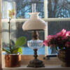Charmfulla Vedebykronan där du har både elbelysning och fotogen som ljuskälla. Lampskärmen är tillverkad i opalvitt munblåst överfångsglas.
